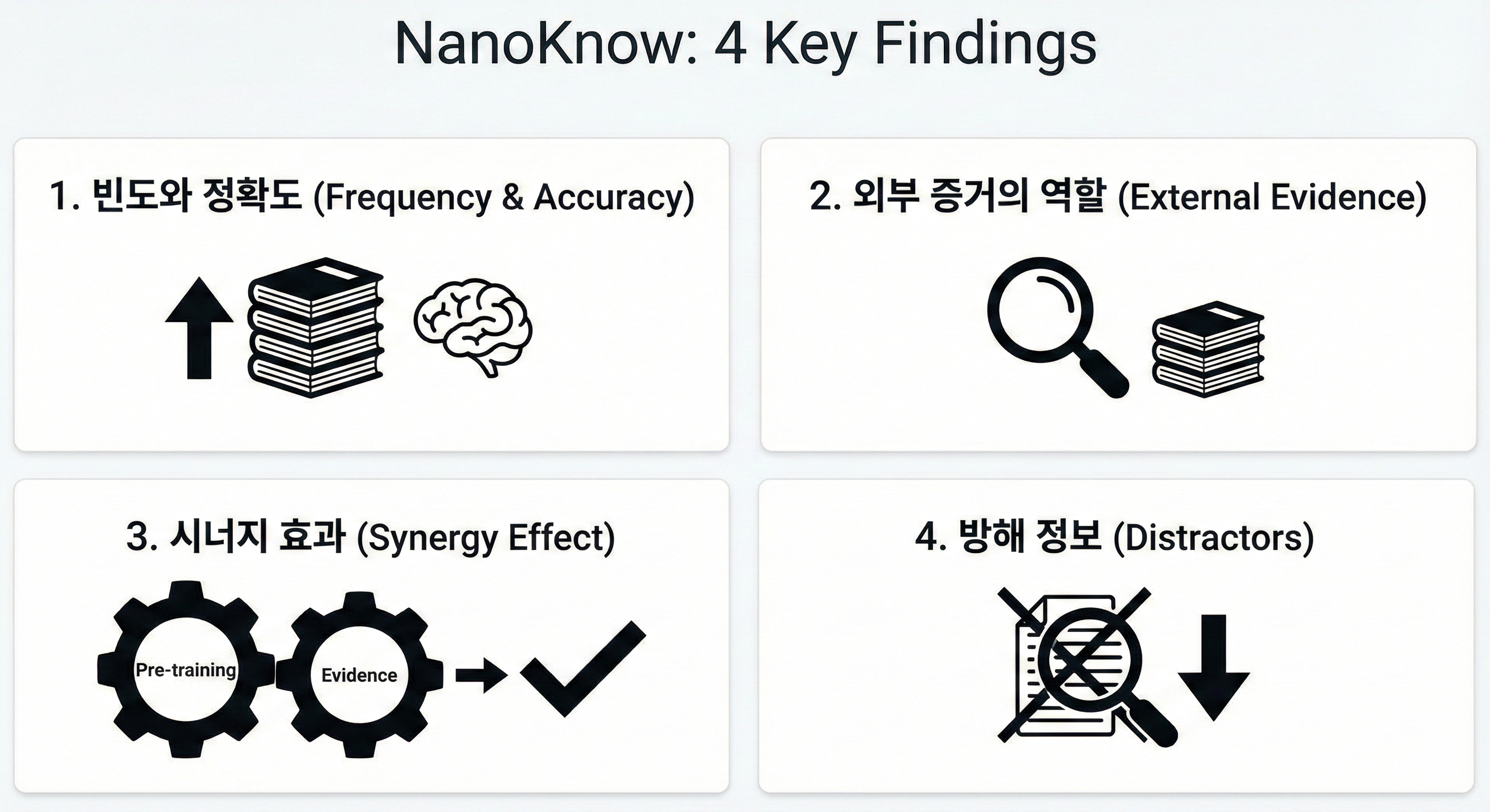 거대한 언어 모델이 정확히 무엇을 알고 있는지 파악하는 것은 늘 어려운 과제였습니다.​학습 데이터가 투명하게 공개되지 않은 블랙박스 상태이기 때문입니다. 최근 이 블랙박스 내부를 들여다보려는 흥미로운 연구 결과들을 접하게 되었습니다.​이번 글에서는 Castorini 연구팀의 NanoKnow 논문을 중심으로 그 핵심 발견을 살펴보고, 이와 맥이 닿는 최근 모델 추론 및 지속적 학습에 관한 연구 동향을 함께 엮어 정리해 보았습니다.​​NanoKnow — 모델은 무엇을, 왜 아는가 ​언어 모델의 파라미터 지식이 어디서 왔는지 추적하는 것은 쉽지 않습니다. 대부분의 최첨단 모델들이 학습 코퍼스를 비공개로 유지하기 때문입니다.​이 문제를 해결하기 위해 연구진은 Andrej Karpathy가 개발한 nanochat..