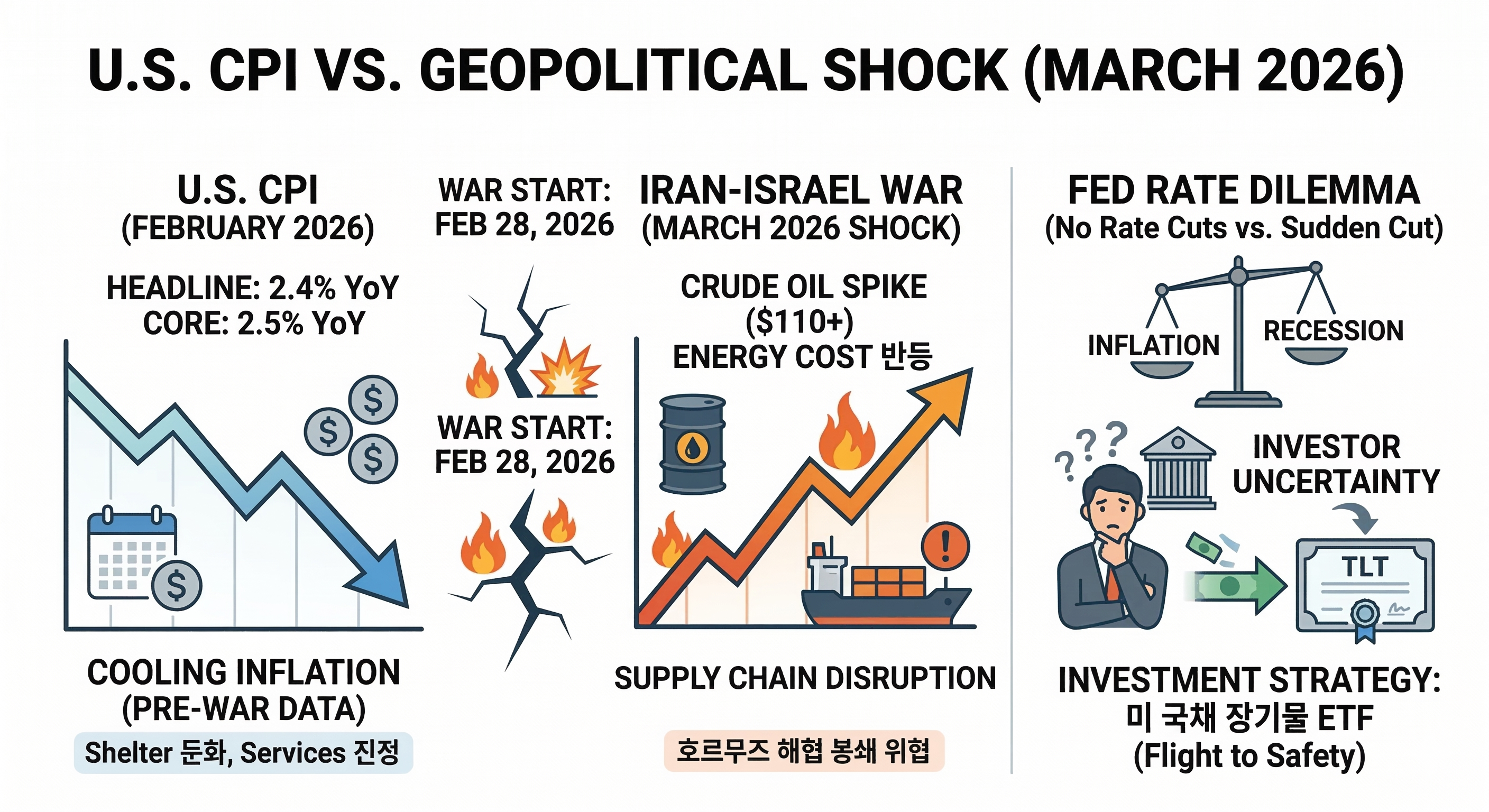 미국 CPI 2월 보고서가 발표되었습니다.​중요한 부분은, 이번 2월 CPI가 헤드라인과 근원(Core) 모두 시장 예상치에 정확히 부합하며 나왔다는 점입니다. 숫자만 보면, 인플레이션이 안정적으로 관리되고 있는 듯한 느낌입니다.​​CPI 세부 내용지표 (Indicator)2월 발표치 (실제)시장 예상치 (컨센서스)1월 발표치 (전월)헤드라인 CPI (YoY, 전년 대비)2.4%2.4%2.4%헤드라인 CPI (MoM, 전월 대비)0.3%0.3%0.2%근원(Core) CPI (YoY, 전년 대비)2.5%2.5%2.5% (유지)근원(Core) CPI (MoM, 전월 대비)0.2%0.2%0.3%바로 이 부분인데요. 솔직히 내용만 보면 나쁘지 않습니다. 오히려 매우 잘 정리되고 있는 느낌입니다. 헤드라인 2.4..
