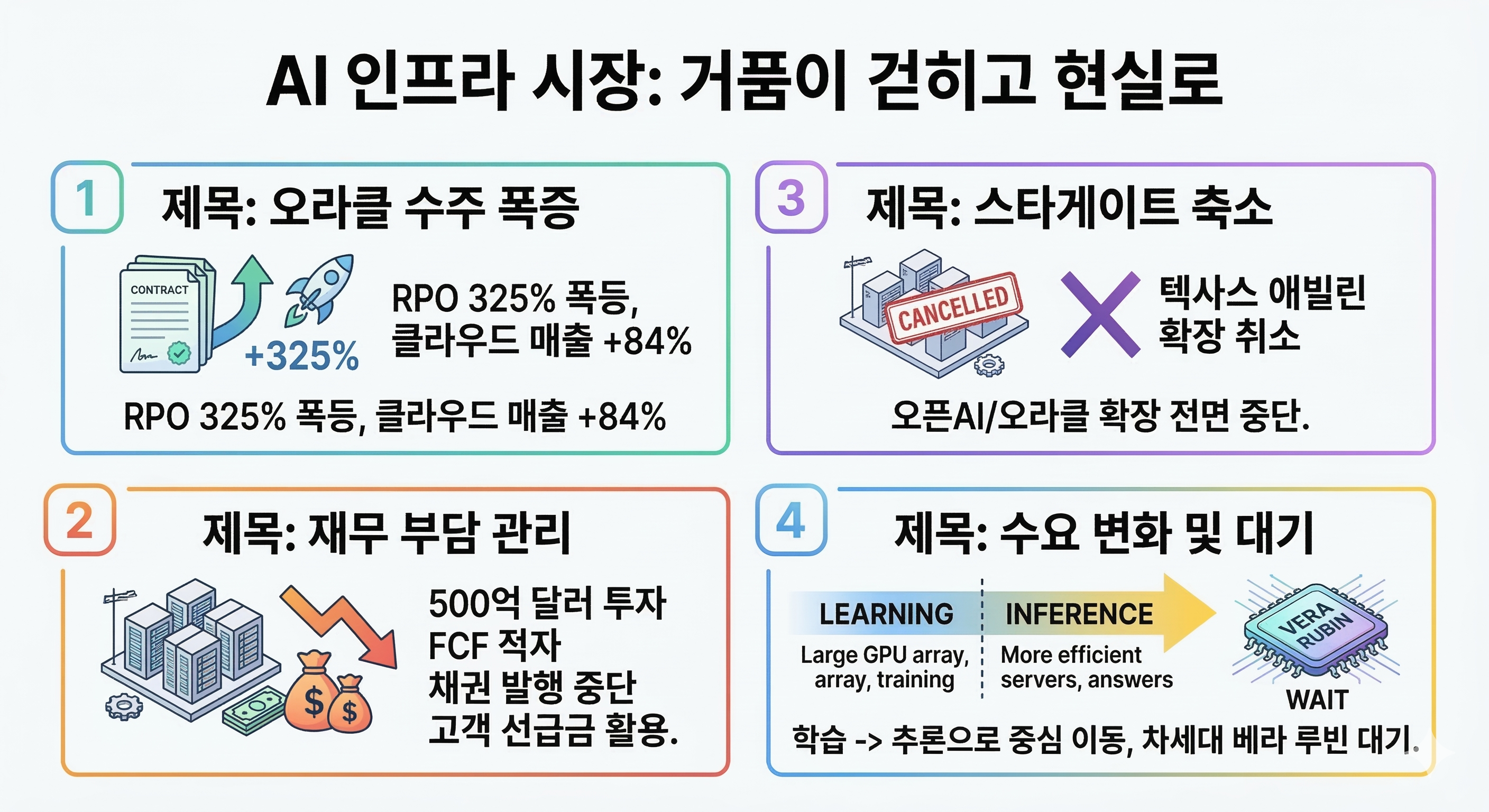 AI 인프라 시장의 분위기가 묘하게 흘러가고 있습니다. 무한한 확장만을 외치던 시기를 지나, 이제는 현실적인 실행력과 자본의 효율성을 증명해야 하는 단계에 진입했습니다. 최근 벌어진 일련의 사건들 — 오라클의 압도적 실적, 스타게이트 애빌린 확장 보류, 마이크로소프트의 데이터센터 동결, 그리고 베라 루빈이 만들어낸 "기다림의 경제학" — 은 하나의 메시지로 수렴합니다. 돈을 태우는 자가 아니라, 돈의 효율을 증명하는 자가 이긴다. 숫자로 증명한 오라클의 인프라 장악력폭발적인 수주 잔고, 거대 인프라 유틸리티 기업으로의 진화오라클의 FY2026 Q3(2025년 12월~2026년 2월) 실적은 시장의 우려를 완벽하게 불식시켰습니다. 총 매출은 전년 동기 대비 22% 증가한 172억 달러를 기록했습니다. 15..